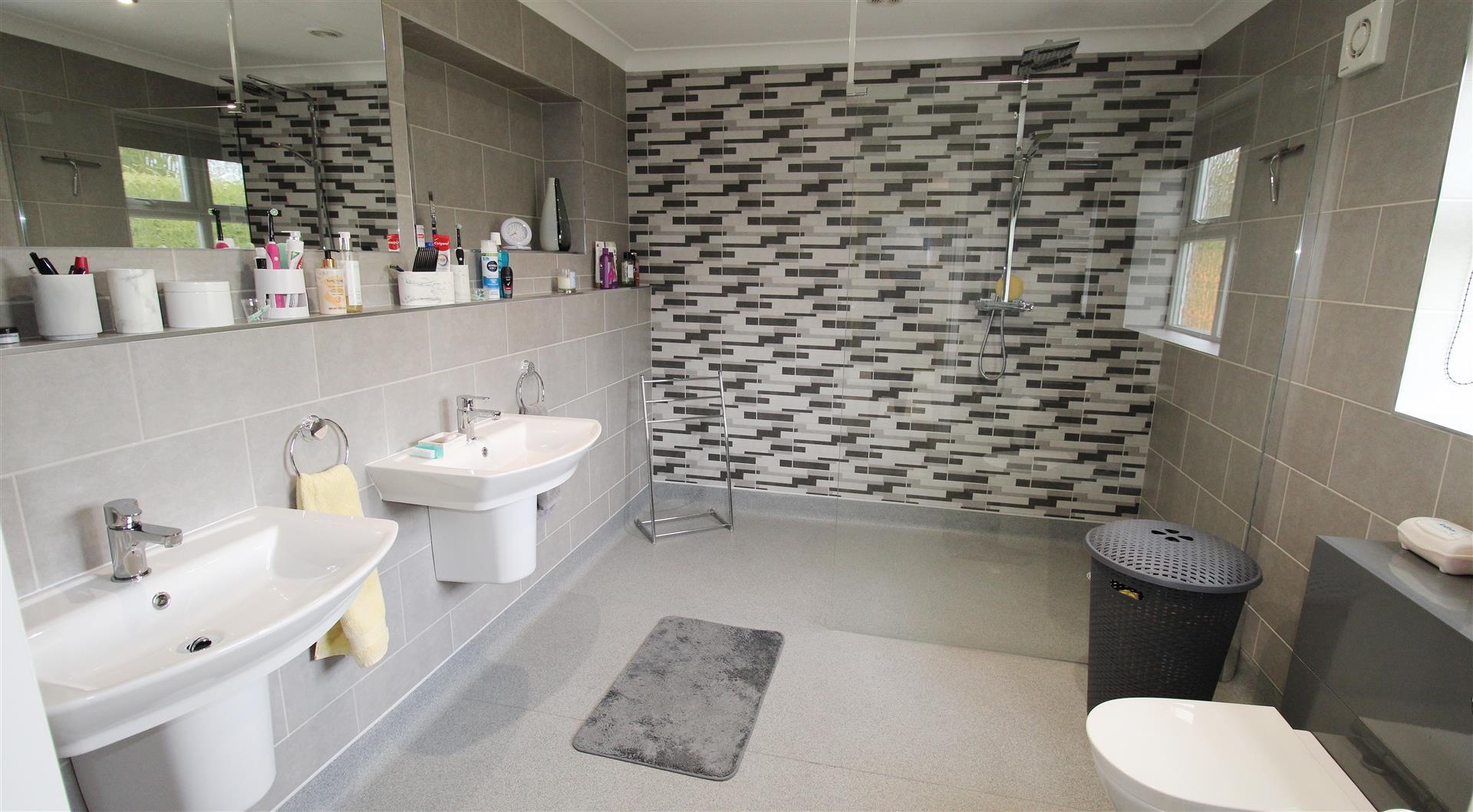 Coved ceiling. Inset ceiling lighting. uPVC double-glazed window to the side. Fully-tiled walls with integrated alcove shelving and large mirror. Low-level WC. 2 x wall-mounted hand basins with stainless steel mixer taps. Walk-in shower with a glass partition and a mains-fed, dual-headed shower. Heated towel radiator. Wet-room flooring.