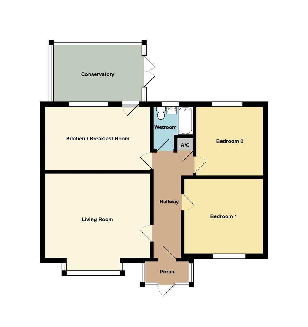 Inside, the property features a good-sized kitchen and a generous living room with a charming feature bay window. A bright conservatory provides a lovely space to enjoy the outdoors year-round. Both bedrooms are well-proportioned and are served by a practical wet room.