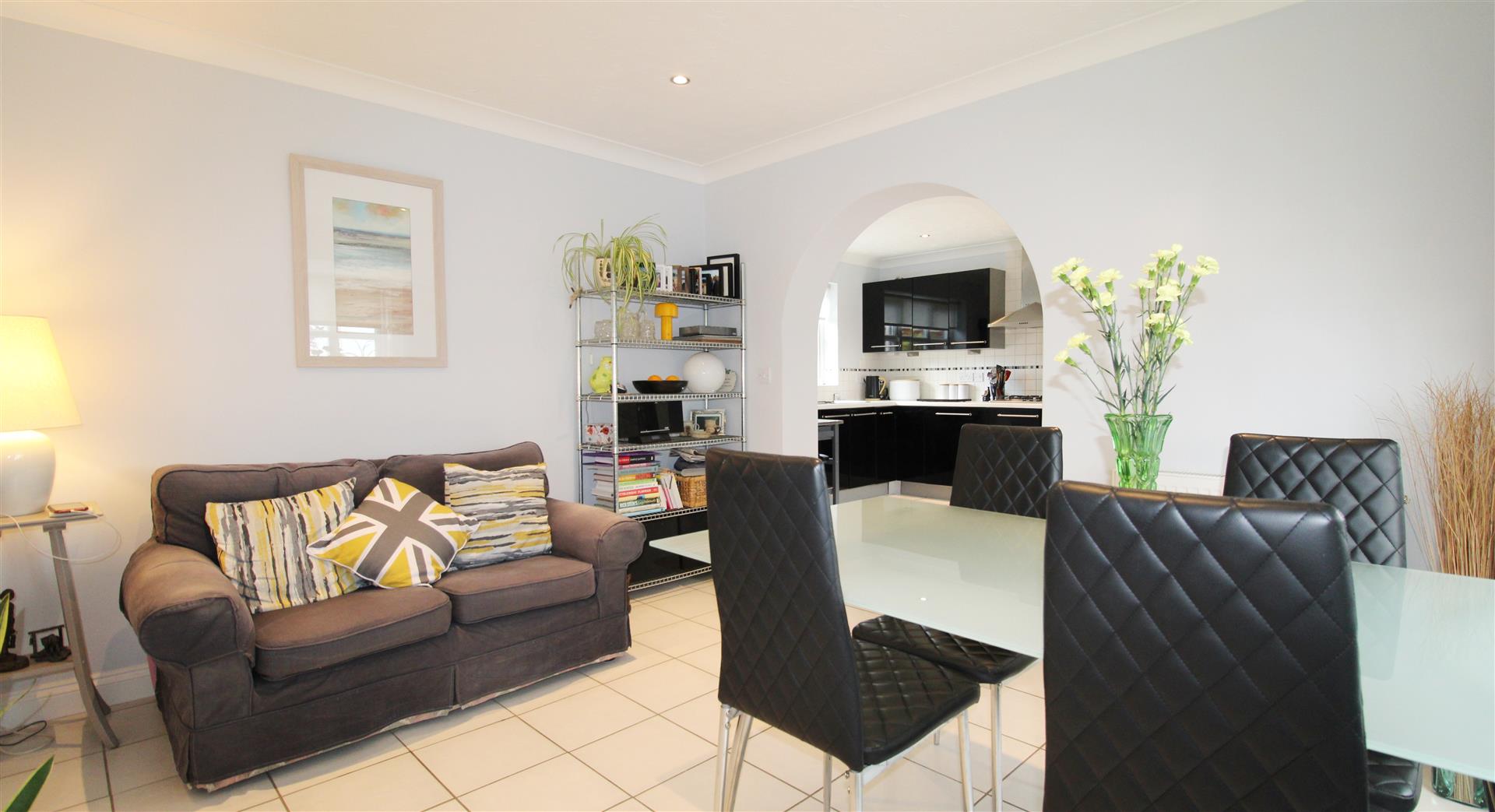 Coved and textured ceiling. uPVC dual aspect windows to front and rear. Matching wall and base units with drawer storage. Tiled splashbacks. Stainless steel sink and drainer with mixer tap over. Gas hob with extractor over. Eye-level double oven. Integrated dishwasher and under-counter freezer. Space for tall fridge freezer. Power points.