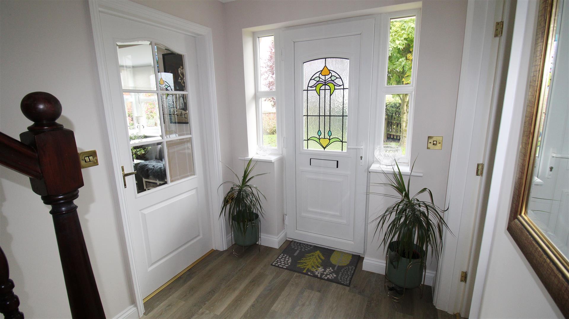 Coved and textured ceiling. Part uPVC, part double-glazed decorative door to front with matching side panels. Power points. Telephone socket. Thermostat. Radiator.