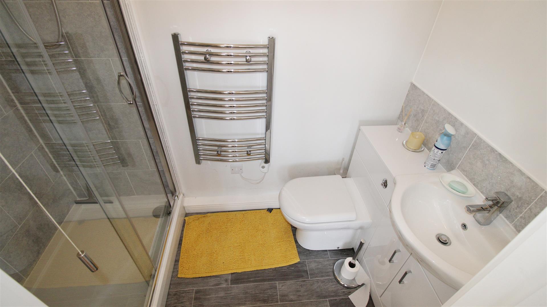 Coved ceiling. Ceiling light. Vanity unit housing a low-level WC and a hand basin. Shower enclosure with a wall-mounted electric shower. Electric heated towel radiator. Linoleum flooring.