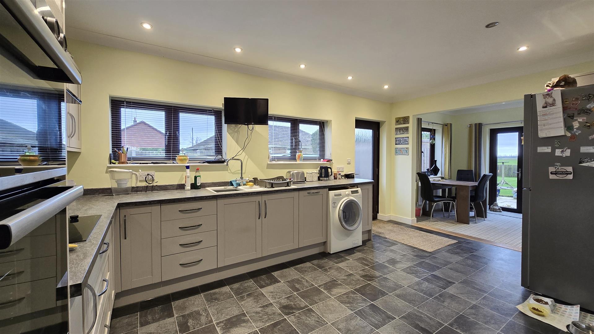 Coved ceiling. Inset ceiling lights. uPVC double-glazed privacy door to the side. 2 x uPVC double-glazed windows to the side. Fitted range of matching wall and base units with a worktop over. 'Beko' eye-level oven and grill. 'Lamona' ceramic hob with extractor fan over. 1 and 1/2 bowl composite sink and drainer with a stainless steel mixer tap and instant hot water tap concealed in under-sink unit. Integrated slimline dishwasher. Under-counter space and plumbing for a washing machine. Space for a tall fridge/-freezer. Tall radiator. 4 x double power-points. Double power-point with dual USB ports. TV aerial point. Additional points for appliances. Linoleum flooring.