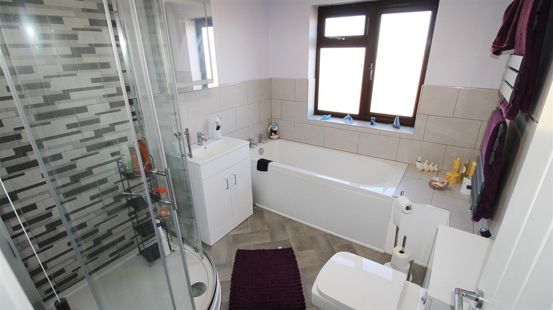 Ceiling light. uPVC double-glazed privacy window to the front. 4-piece suite comprising a low-level WC, a vanity hand basin with a mirrored vanity cupboard over, a panel bath with twin taps and a corner shower cubicle with a tiled splashback and a wall-mounted 'Mira' electric shower. Part-tiled walls. Linoleum flooring.