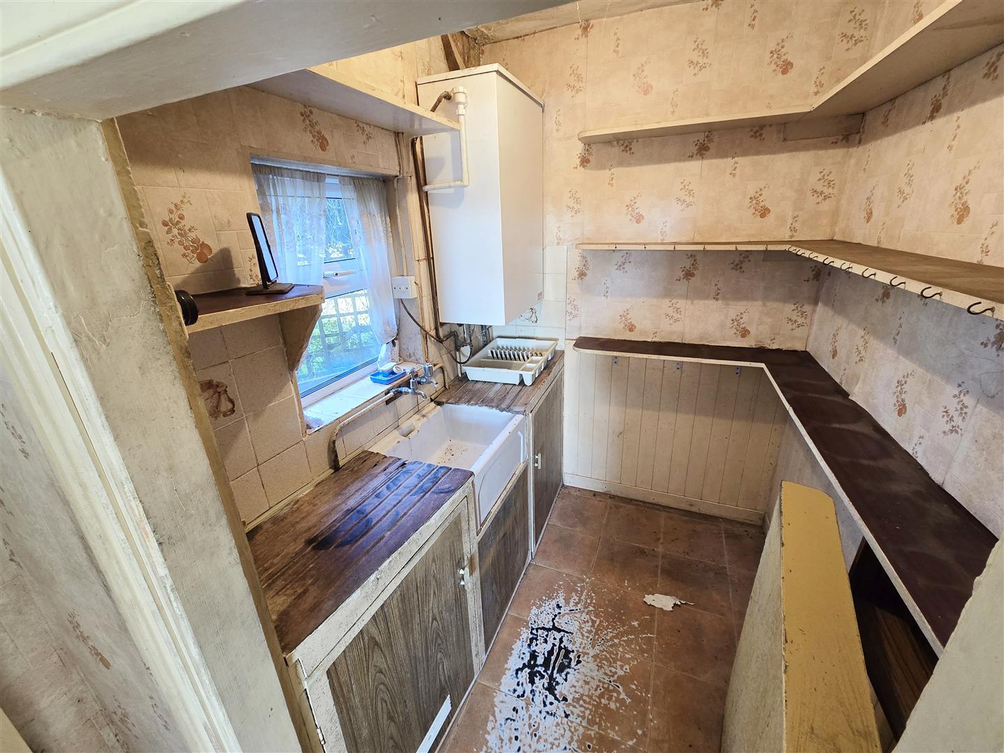 uPVC double-glazed window to side. Ceramic butler sink with twin taps. Wall-hung 'Redring' water heater. Tiled floor.