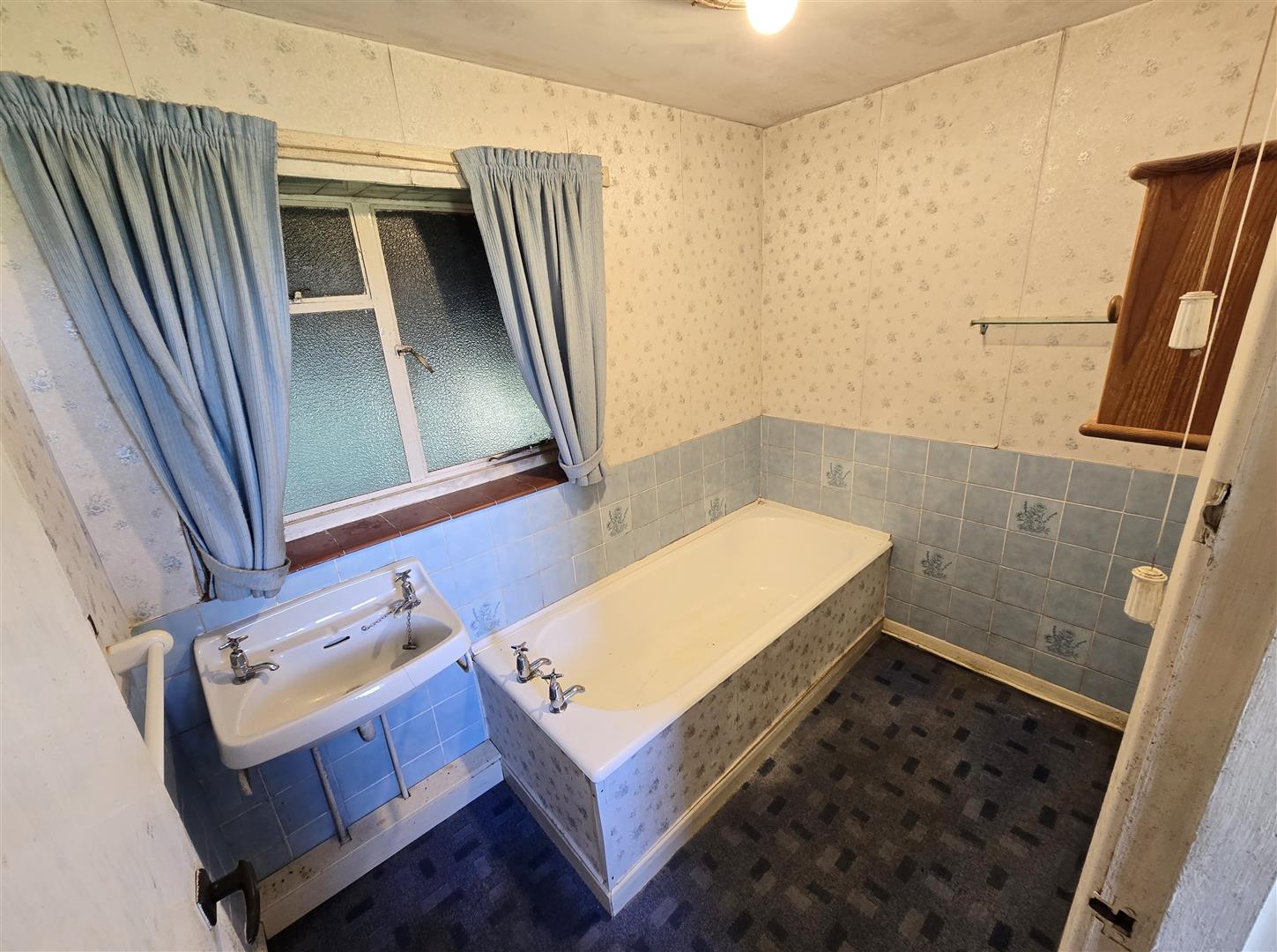 Metal frame single-glazed window with privacy glass to side. Wall-hung hand basin. Panelled bath with twin taps.