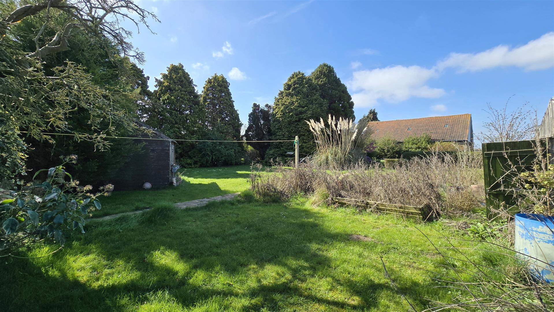 To the rear of the property, there is a wooden shed for additional storage. The driveway offers multiple parking spaces, suitable for several vehicles, a caravan, or a motorhome.
