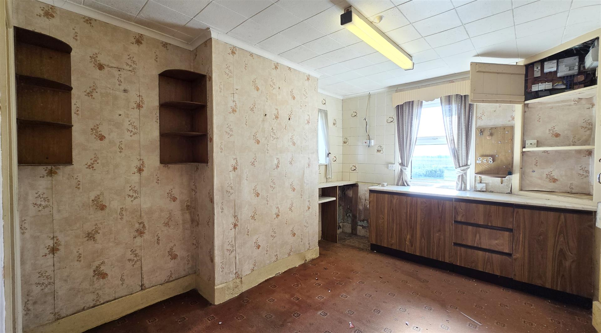 Metal frame single-glazed window to side. Electric storage heater.