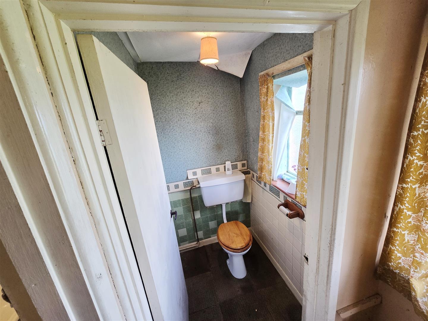 Metal frame single-glazed window to side. Low-level WC. Part tiled wall.