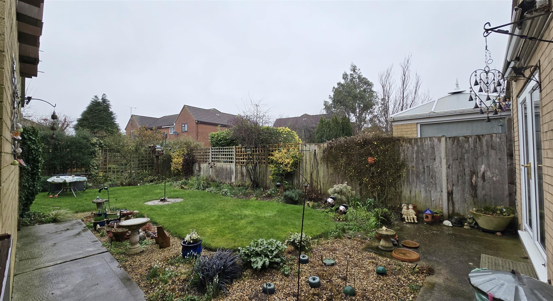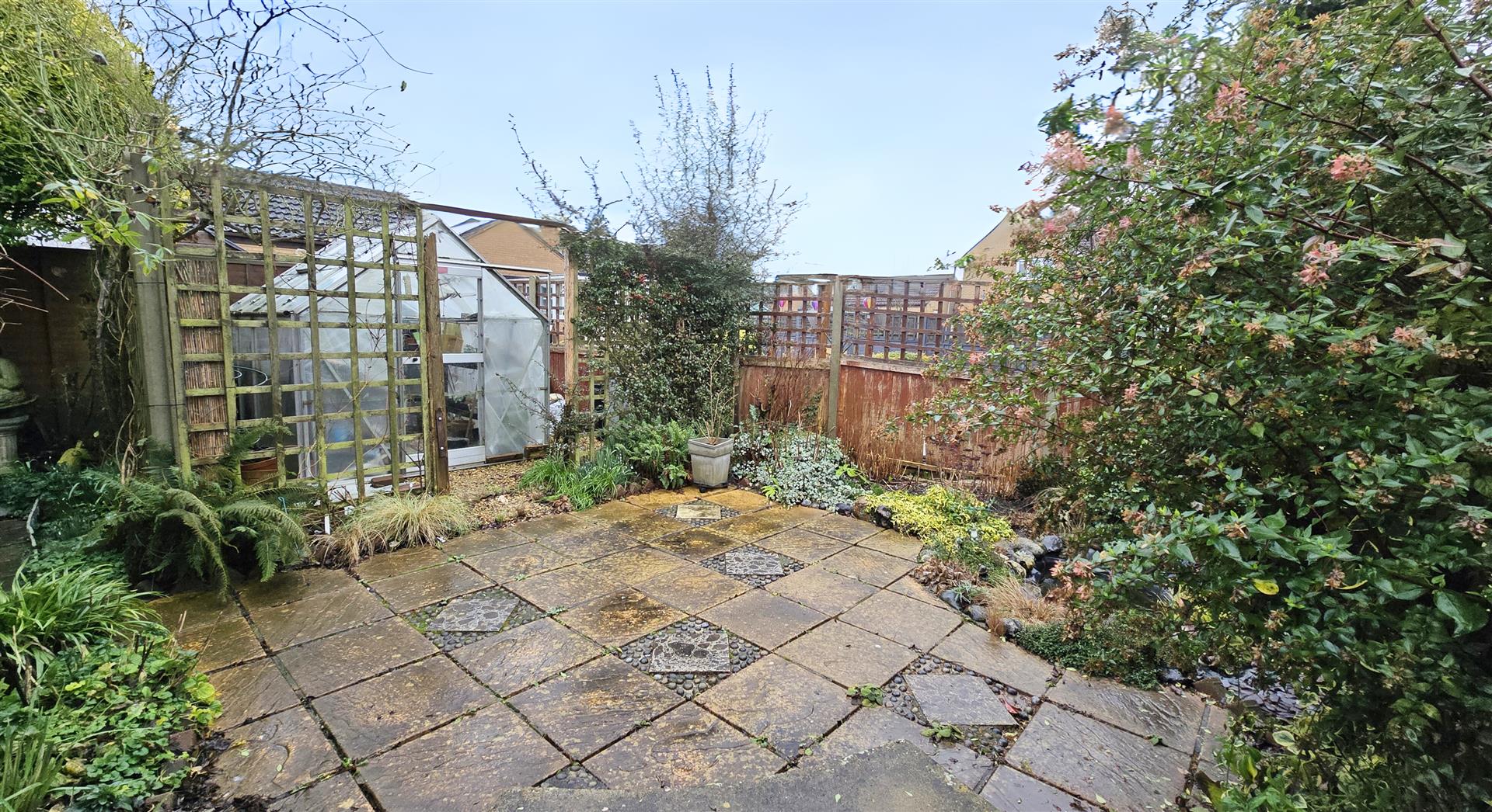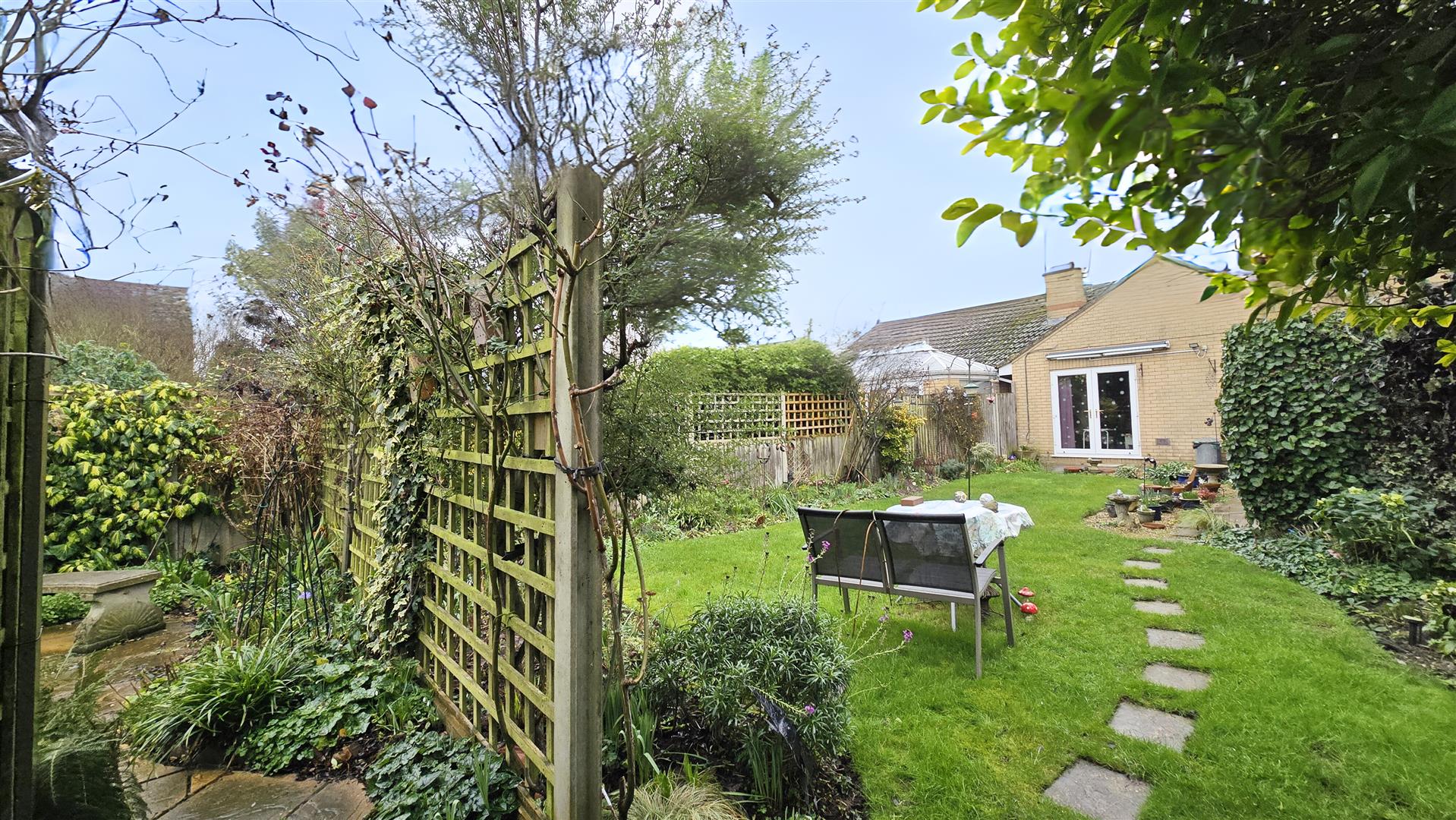 To the rear lies a fully enclosed, beautifully maintained garden offering a tranquil and private retreat, ideal for gardening enthusiasts. The well-manicured lawn is framed by decorative flower beds, creating a peaceful and picturesque setting. A charming stepping-stone pathway leads to the rear of the garden, where a trellis-enclosed patio area provides a serene space to relax, surrounded by established flower beds and a greenhouse.