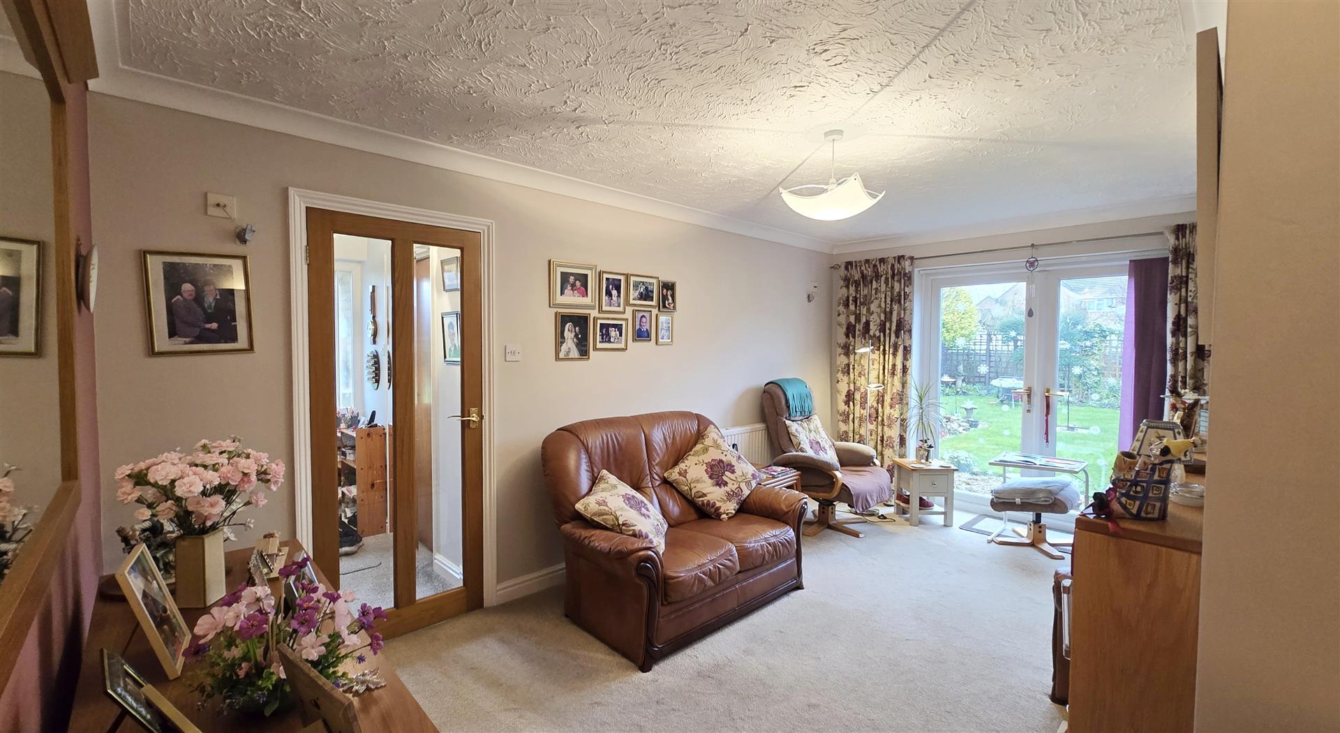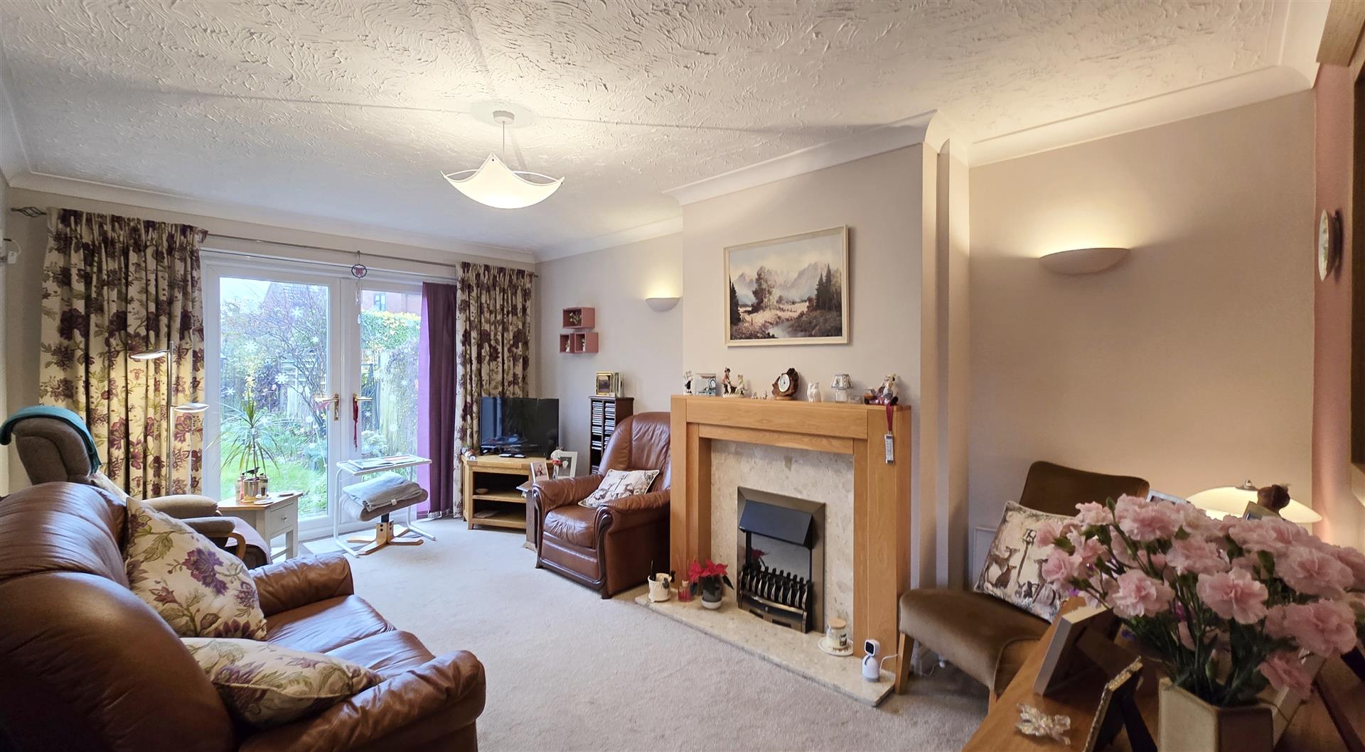 Coved and textured ceiling. uPVC patio doors to garden. Feature electric fire sat on marble hearth with wood surround. 2 x wall lights. Telephone point. Power points. Radiator.