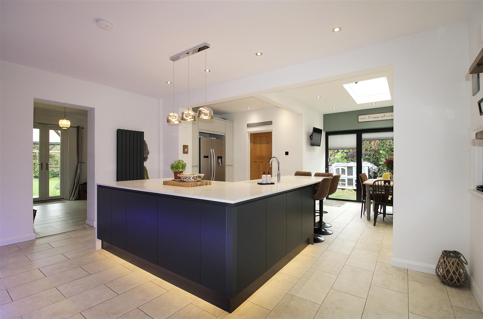 Inset ceiling lights and feature island light. Skylight. Double-glazed bi-folding doors to side. Fitted range of contemporary wall and base units comprising a combination of cupboards and drawers with quartz worktops over and LED lighting under. 3 x eye-level 'Hisense' ovens. Eye-level 'Electric' microwave. 'Bosch' warming tray. Ceramic hob with integrated extractor over. Space for a freestanding American-style fridge-freezer. Extensive centre island with inset 1 and 1/2 bowl ceramic sink with 'Quooker' tap providing instant boiling and filtered water, an integrated 'Hotpoint' dishwasher, a wine cooler and integrated bins providing space for breakfast stools. 2 x tall radiators. 8 x double power-points, 1 x single power-point and additional power-points for appliances. Glazed privacy serving hatch to bedroom 1. Tile flooring.