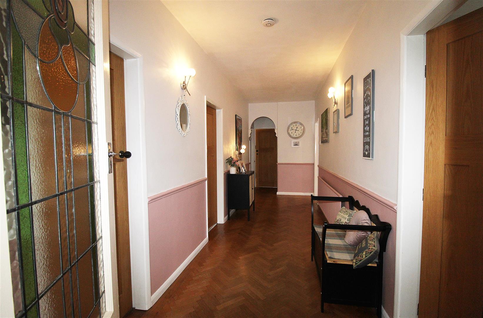 Papered textured ceiling. Smoke detector (wifi linked). Wooden-framed double-glazed stained glass door with matching side panels from the porch. Loft hatch providing access to partially boarded loft. 2 x wall lights. Dado rail. Radiator. 1 x single power-point. BT point. Parquet flooring.
