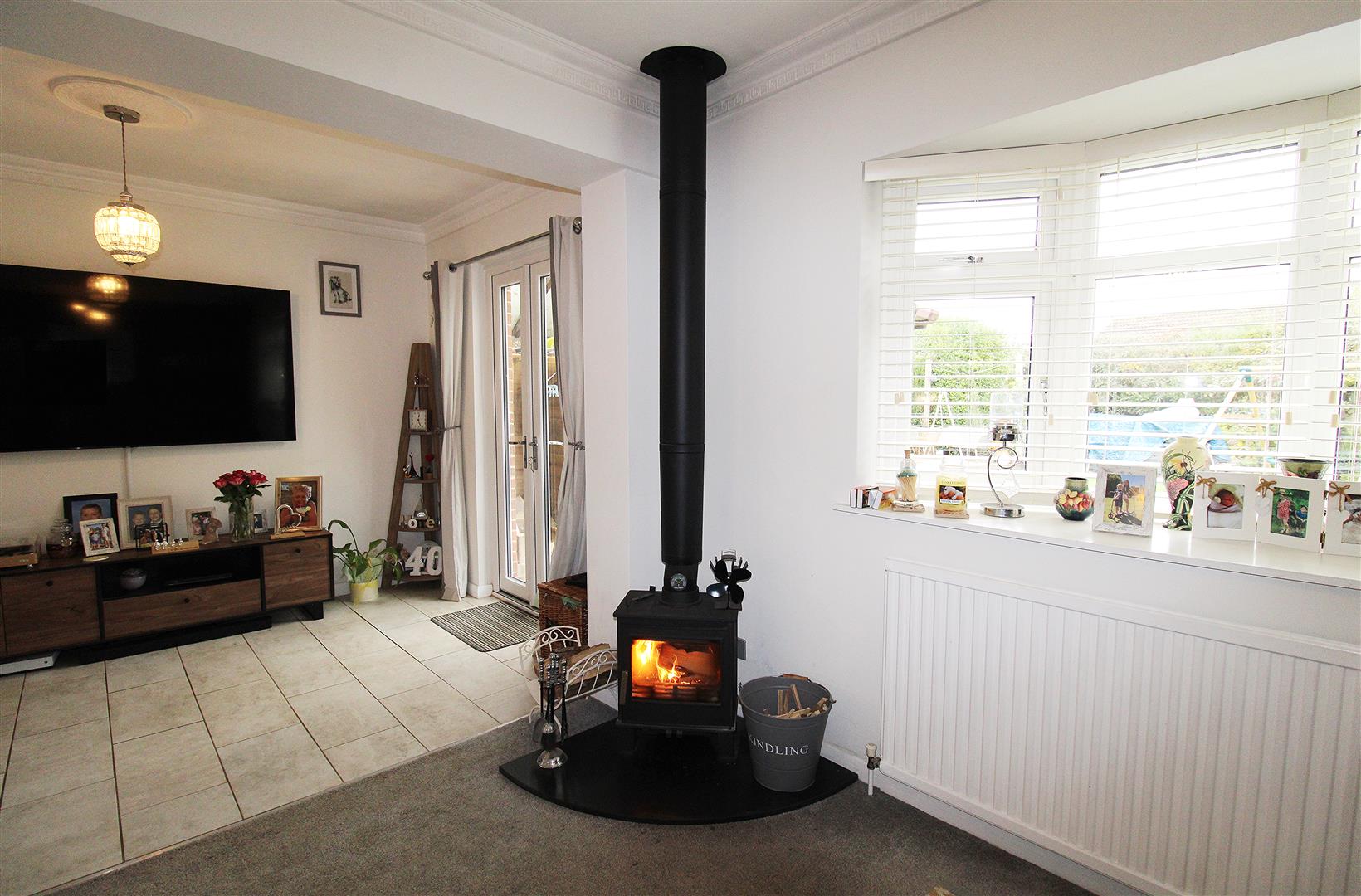 Ceiling rose with light. uPVC double-glazed bay window with fitted window seat to front. Chimney breast with wooden mantle and inset log-burning stove. Picture rail. Serving hatch with privacy glazing to kitchen. Radiator. 1 x double emergency power-point and 1 x single power-point. Wooden flooring.