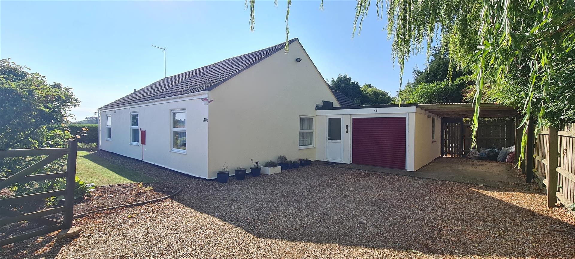 To the front boundary of the property is post and rail fencing beyond which is a lawned garden with a pretty established flower bed. The 5-bar gates at the boundary open on to the gravelled driveway which provides off-road parking for vehicles. The carport provides covered parking for 1 vehicle, with further parking available in the garage if required. Pedestrian gates provide access to the rear garden.