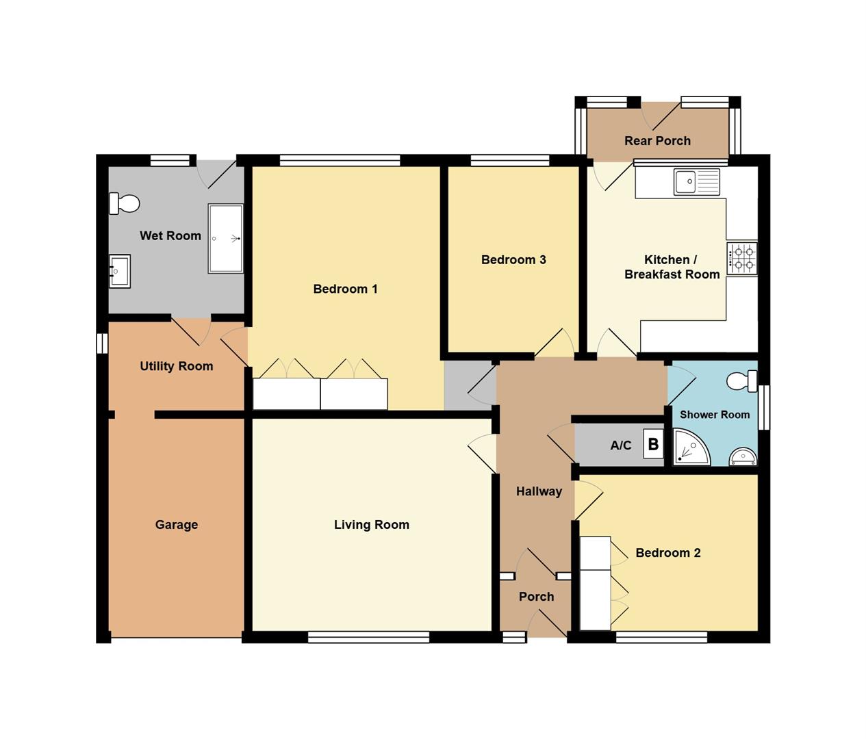 Whilst neatly presented and move-in ready, the bungalow offers scope for re-modelling should the buyer wish. Off the welcoming entrance hall, the property boasts generous accommodation, currently comprising a bright and airy living room, a fitted kitchen/breakfast room with under-counter space for appliances and a rear porch off, and a shower room. There is a super-king size master bedroom with a utility room and wet room off, plus two further well-proportioned double bedrooms, one of which offers fitted wardrobes.