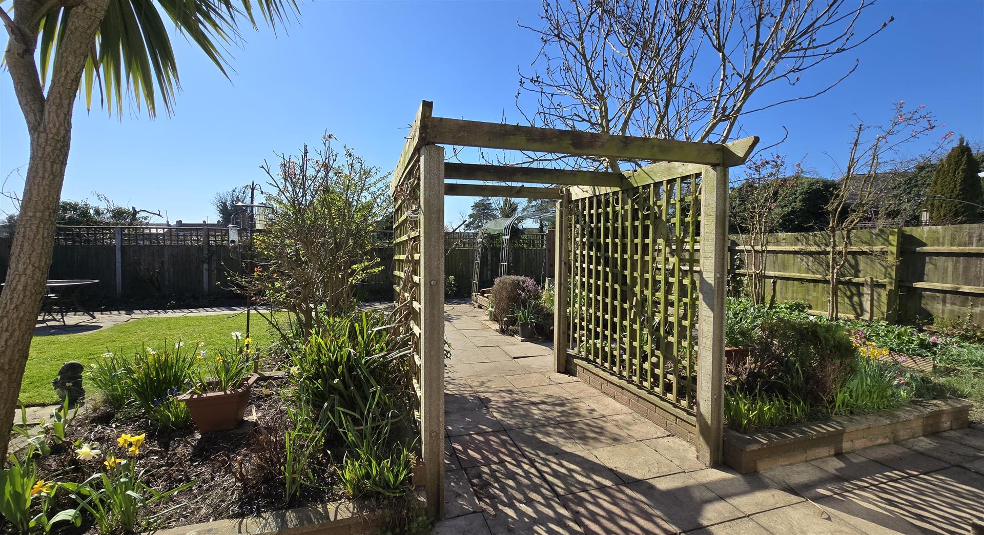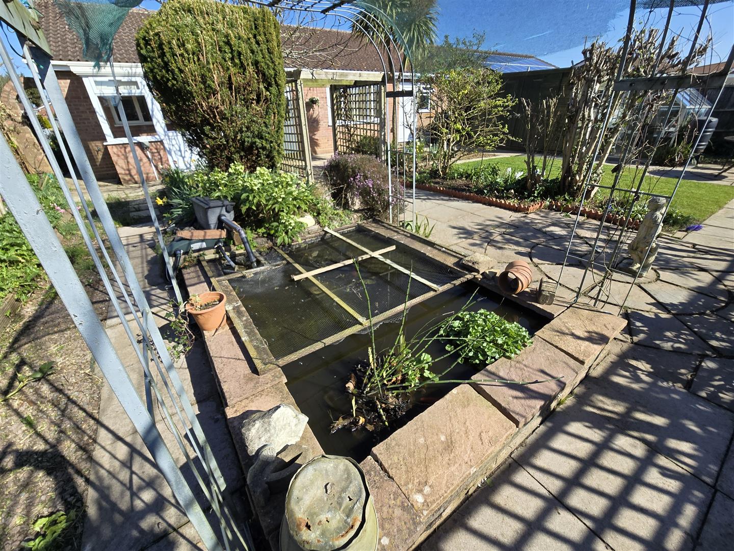 To the rear of the property is a good-sized, private and not overlooked garden, fully enclosed with fencing. The garden is laid to a combination of patio with decorative rotundas, ideal for positioning an outside table and chairs, an area of lawn, and established but cared-for beds of shrubs, bushes and trees. The fish pond adds extra interest and a relaxing ambiance with the sound of the water filtering. The garden further benefits from a wooden storage shed and a greenhouse.