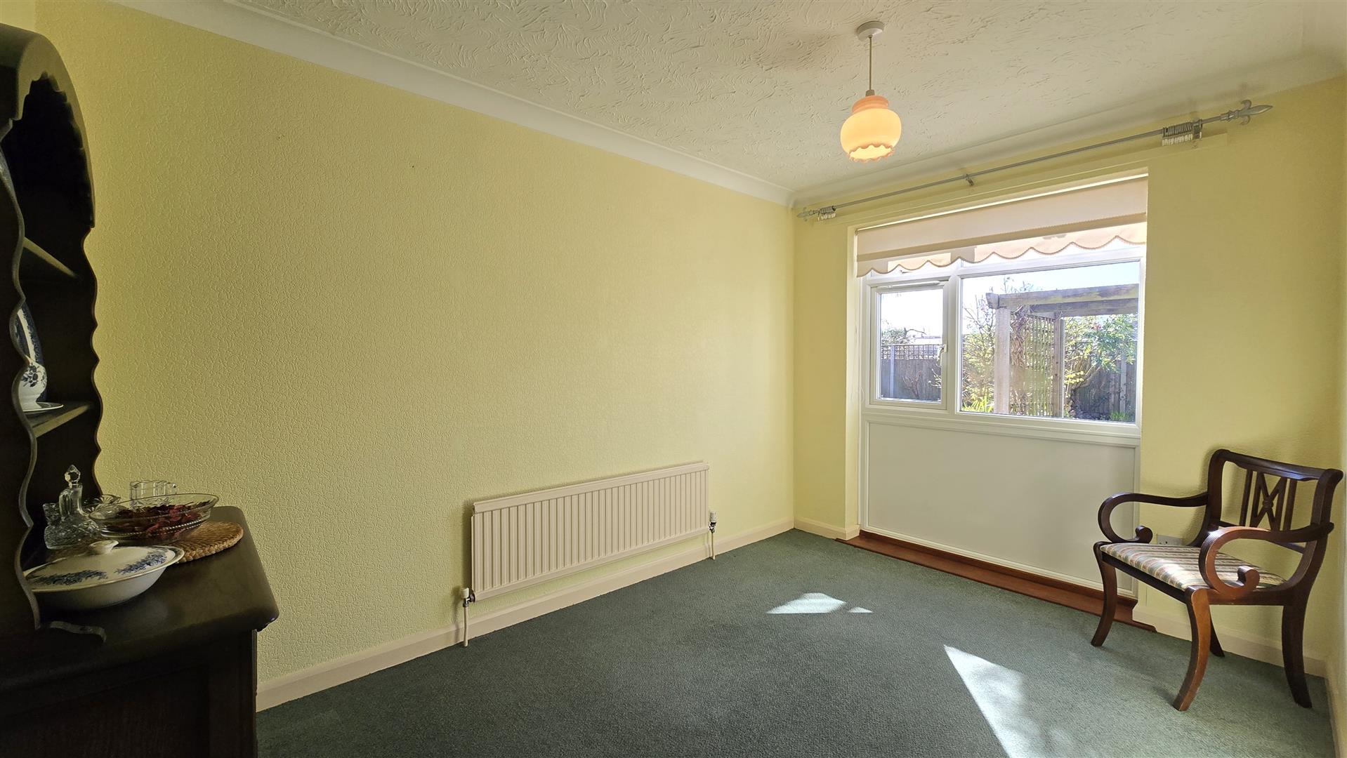 Coved and textured ceiling. Ceiling light pendant. uPVC double-glazed window to the rear. Radiator. Double power-point. Single power-point. Carpet flooring.