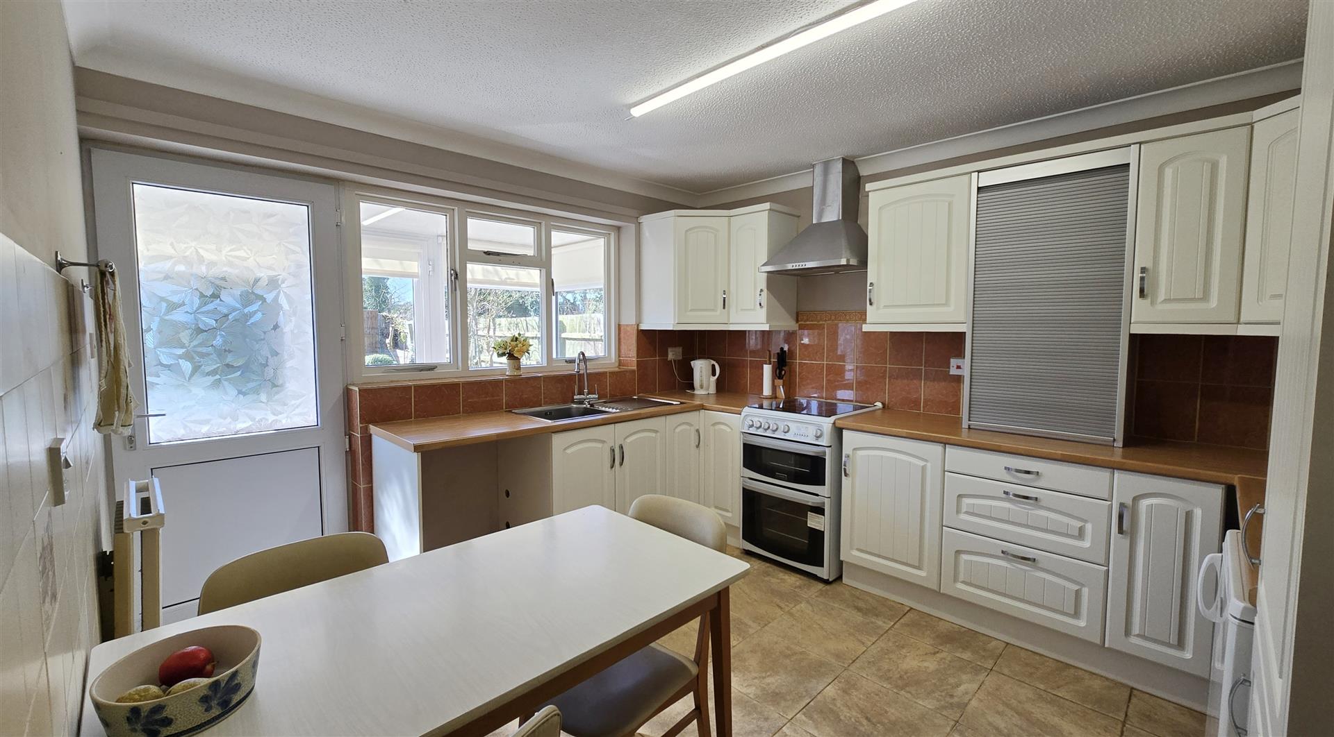Coved and textured ceiling. Strip light. Wooden-framed, double-glazed window to the rear porch. Fitted range of matching wall and base units with a worktop over and a tiled splashback. Stainless steel sink and drainer with a stainless steel mixer tap. Freestanding 'Cannon' oven and grill with a 4-burner gas hob and a stainless steel extractor over. Space and plumbing for a dishwasher. Undercounter space for a fridge and a freezer. Radiator. 3 x double power-points. 2 x single power-points. Tile flooring.